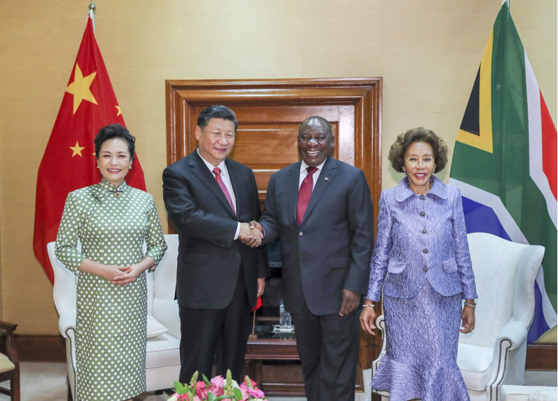 7月24日,国家主席习近平在比勒陀利亚同南非总统拉马福萨举行会谈。这是会谈前,习近平和夫人彭丽媛同拉马福萨和夫人莫采佩合影。新华社记者 谢环驰 摄