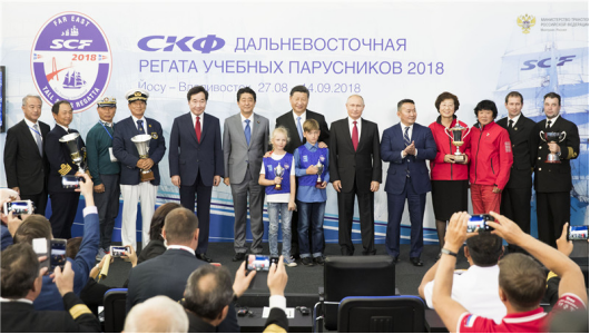 9月12日,第四届东方经济论坛全会在符拉迪沃斯托克举行。中国国家主席习近平、俄罗斯总统普京、蒙古国总统巴特图勒嘎、日本首相安倍晋三、韩国总理李洛渊等出席。这是全会后,与会各国领导人共同出席第三届“远东杯”国际帆船拉力赛第一赛段颁奖仪式。新华社记者 黄敬文 摄