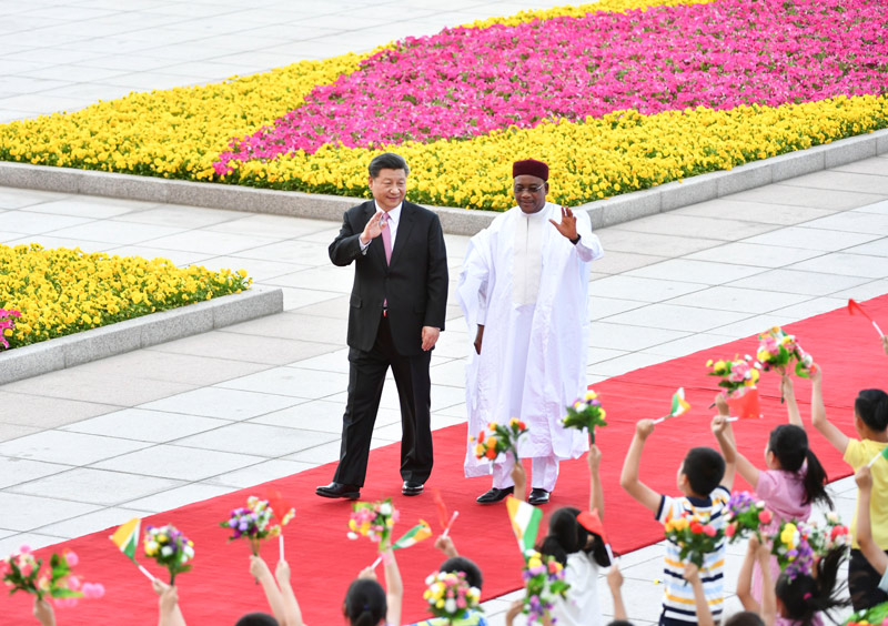 5月28日,国家主席习近平在北京人民大会堂同尼日尔总统伊素福举行会谈。这是会谈前,习近平在人民大会堂东门外广场为伊素福举行欢迎仪式。新华社记者 刘卫兵 摄