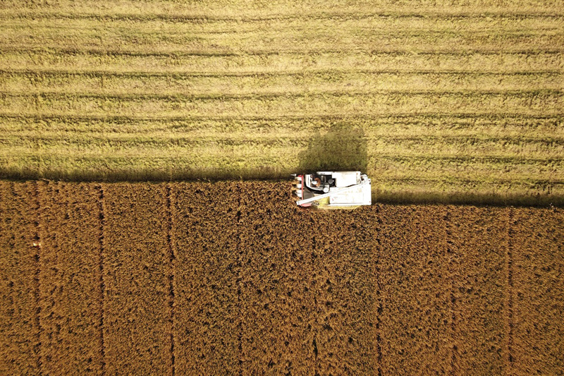 11月13日,在江苏省淮安市洪泽区高良涧街道,农民驾驶农机在田间收获水稻(无人机拍摄)。