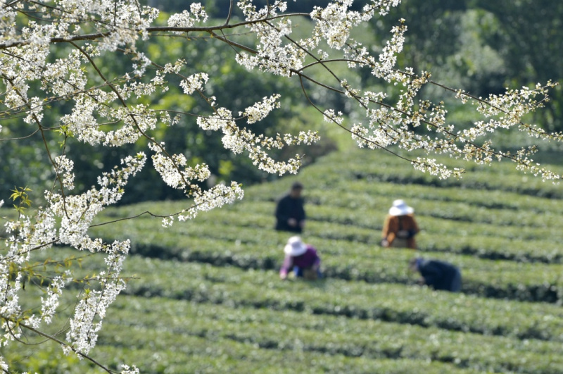 随着天气回暖,湖北省恩施土家族苗族自治州宣恩县境内山花烂漫,茶园吐绿,当地茶农伴着花香在茶园中劳作。
