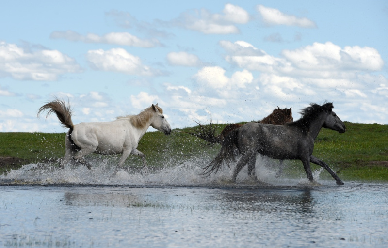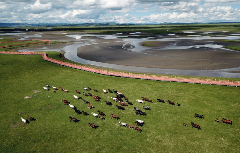 6月22日,在玛曲县河曲马场,几匹河曲马在草原湿地旁奔跑。