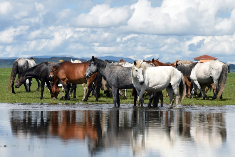 6月22日,在玛曲县河曲马场,一群河曲马在草原湿地旁觅食休憩。