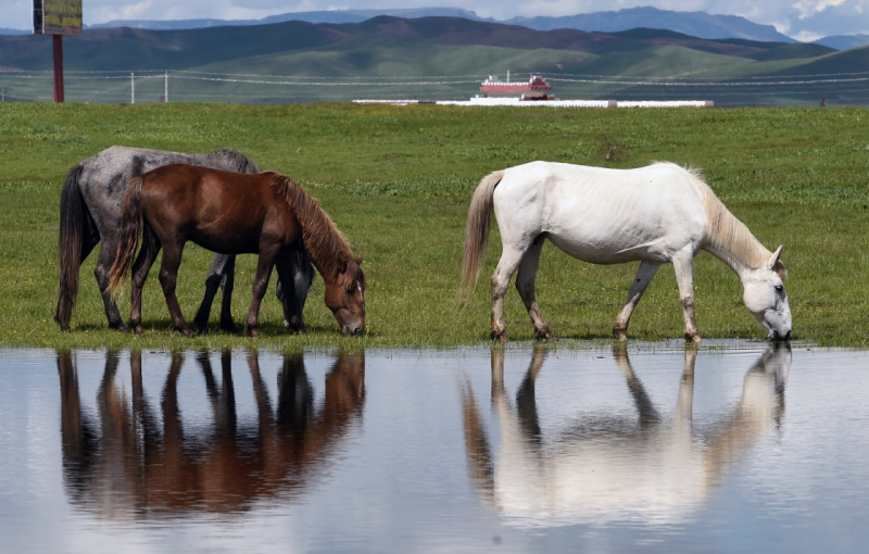 6月22日,在玛曲县河曲马场,几匹河曲马在草原湿地旁觅食休憩。