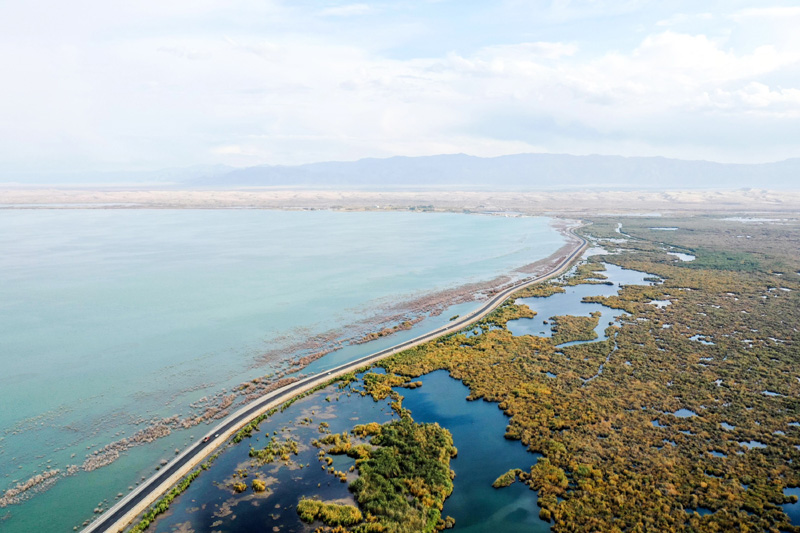 入秋以来,新疆博斯腾湖碧波荡漾,美景如画,吸引各地游客前来游玩。