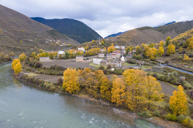 金秋十月,四川省康定市新都桥镇景色宜人,树木、河流、村落构成一幅幅美丽画卷。