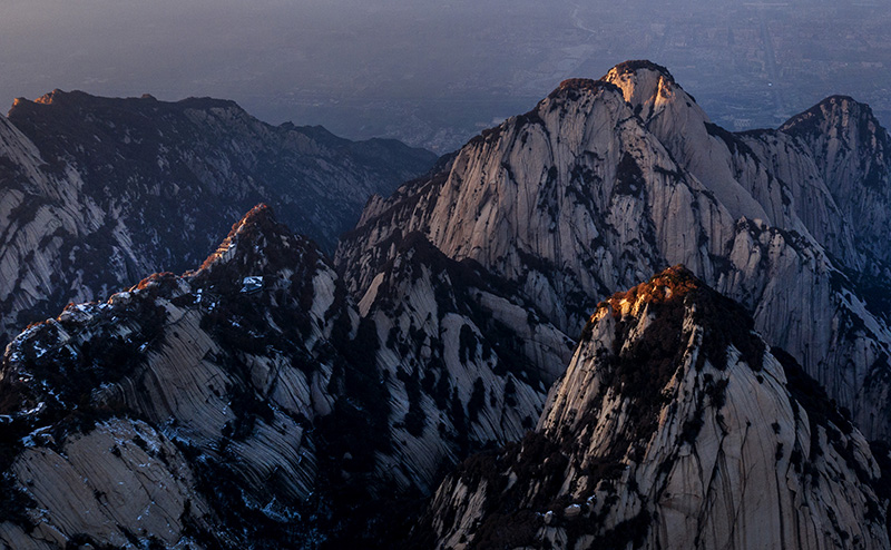 冬日的华山,在夕阳的映照下,绽放出炫目的色彩,与蓝色的天空、金色的晚霞构成壮美的画卷。