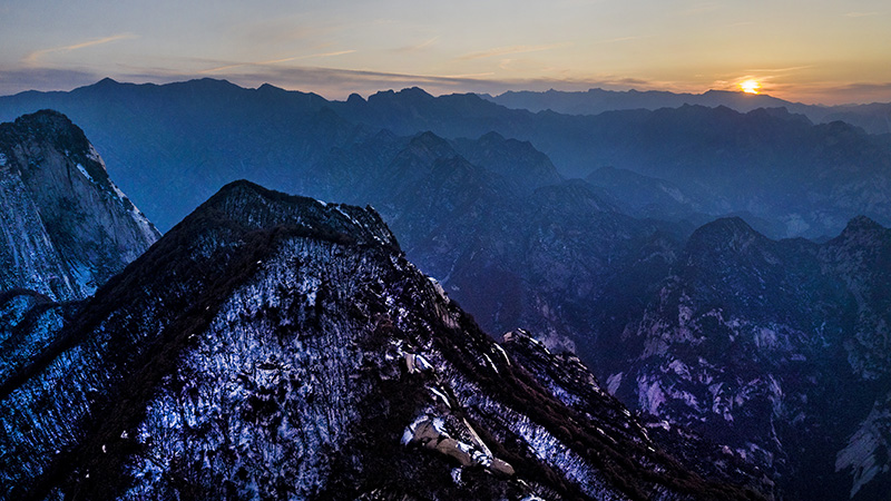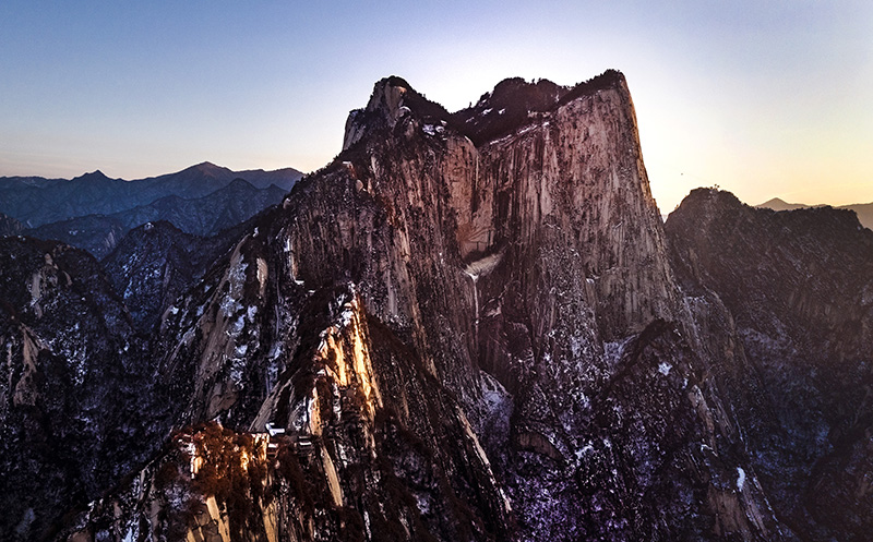夕阳下的西岳华山(12月4日无人机拍摄)。