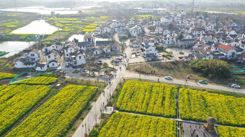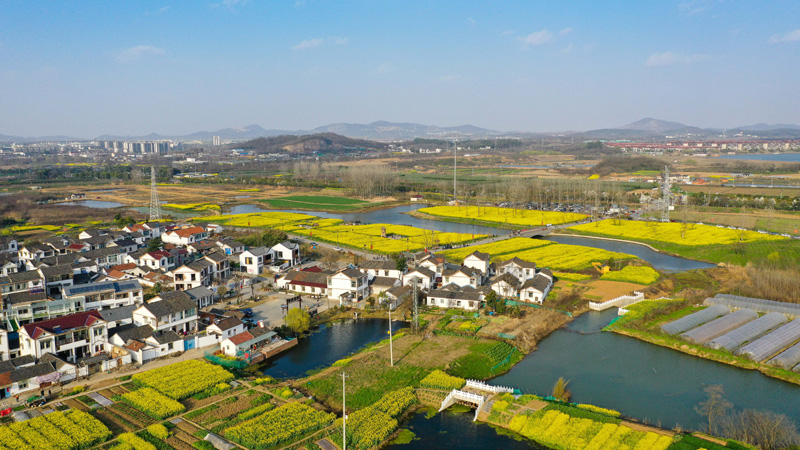 3月14日,南京市江宁区谷里街道徐家院村盛开的油菜花和村舍构成美丽的图画(无人机照片)。