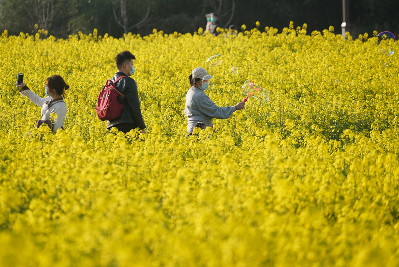 3月14日,游人在南京市江宁区谷里街道徐家院村油菜花田里放松身心。