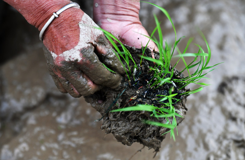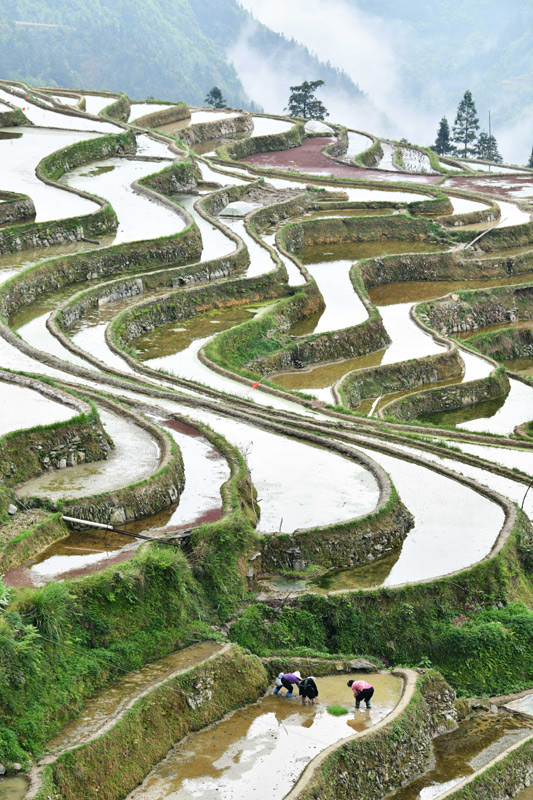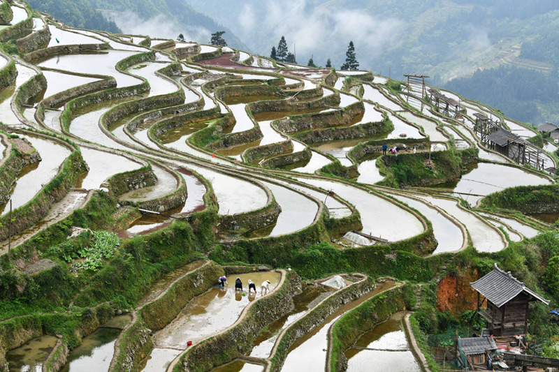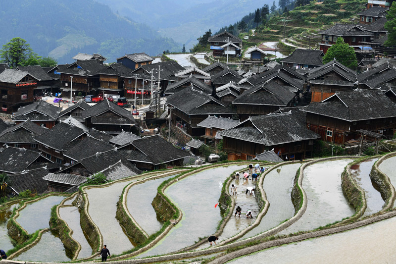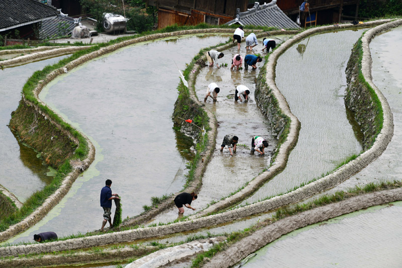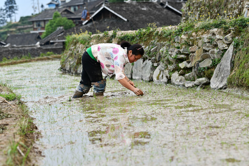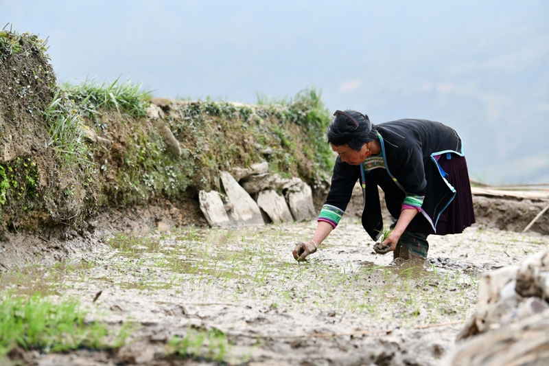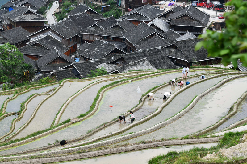近日,贵州省从江县加榜乡雨量充足,梯田蓄水充盈,农民抢抓农时移栽稻谷小秧苗,梯田上一片繁忙景象。