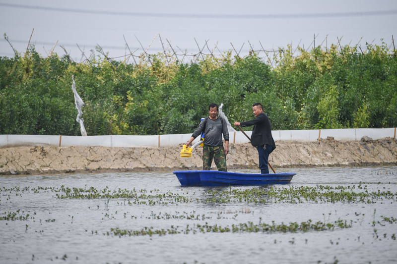 5月6日,东林镇泉益村村民沈建利(右)与工人一起在稻田里给小龙虾喂食。沈建利今年三月承包了村里100亩闲置土地,作为稻虾混养的养殖基地,投放了5000斤小龙虾苗,将与6月播种的水稻一起进行生态养殖,每亩收益可达5000元左右。