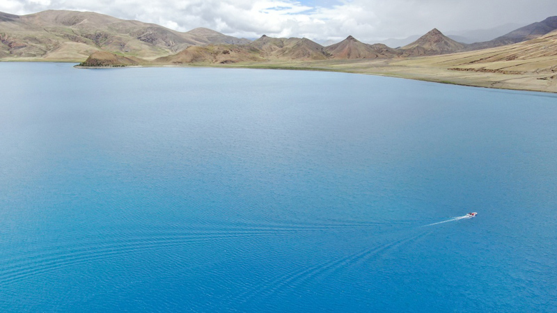 科考队成员乘船前往羊卓雍错主湖区进行考察(7月22日无人机拍摄)。