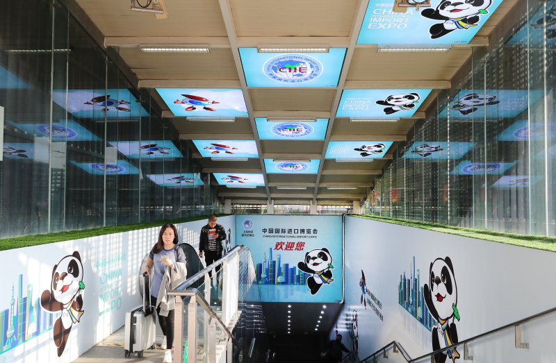 位于国家会展中心(上海)的地铁站出入口装饰着进博会元素(10月21日摄)。