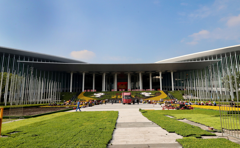 10月21日,国家会展中心(上海)南广场进博会鲜花装饰工程效果初现。