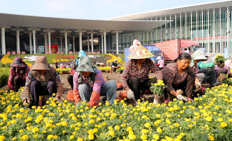 10月21日,工人们在国家会展中心(上海)南广场布置进博会鲜花装饰。