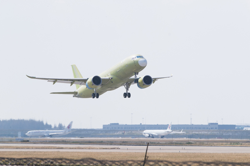 10月24日,C919大型客机105架机在上海浦东国际机场起飞。新华社发