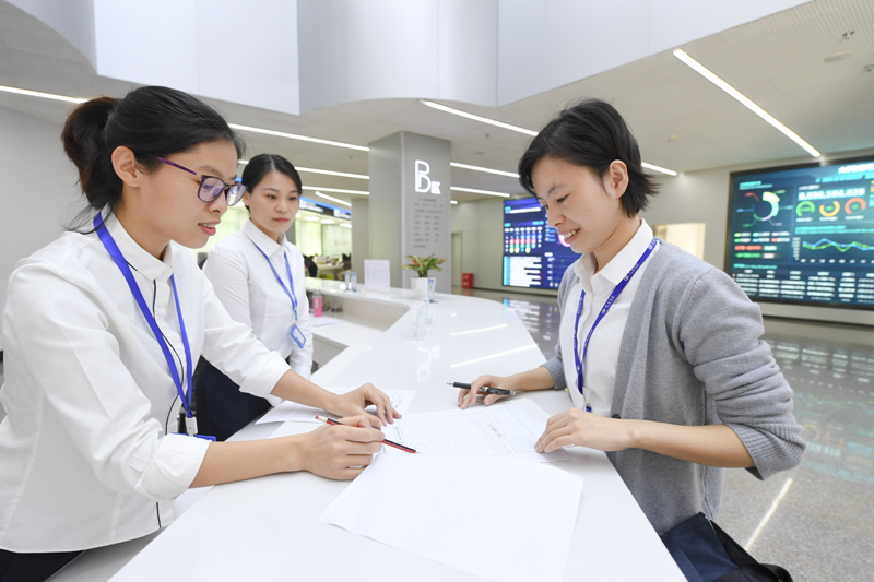 10月30日,在福建省泉州市泉港区行政服务中心,工作人员在为企业人员办理业务。