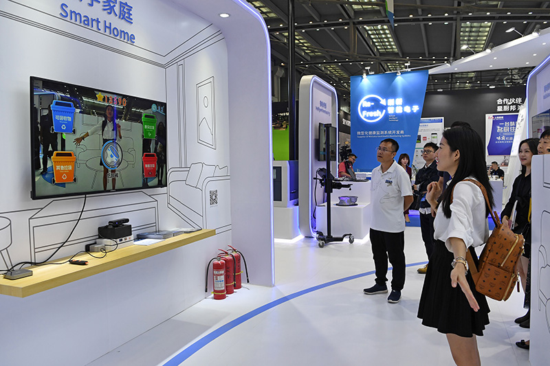 11月13日,观众在第二十一届高交会上参与垃圾分类互动游戏。