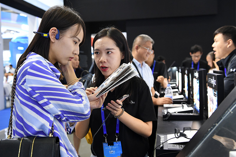11月13日,观众在第二十一届高交会上了解耳机产品。
