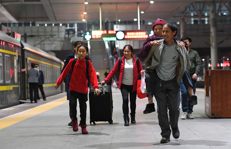 1月10日,在深圳东站,乘坐K4526次列车的乘客秦运林背着76岁的母亲,带着妻子(后中)和女儿(后左一)踏上回家路。
