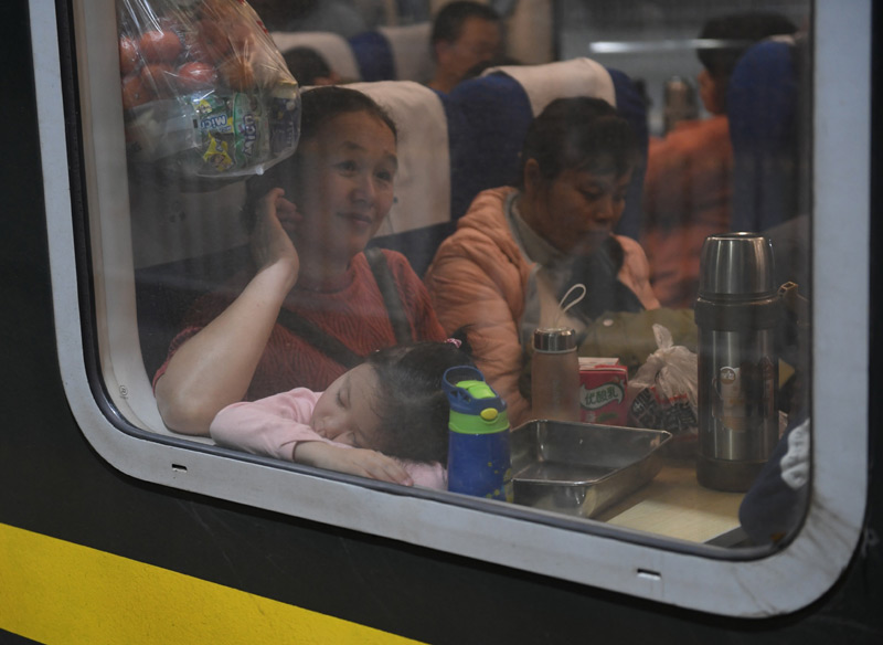 1月10日,在北京火车站,乘坐K4051次列车的小朋友向火车窗外招手。