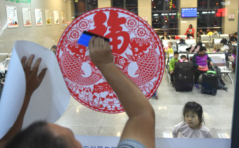 1月10日,在深圳东站候车室,小乘客在看工作人员贴窗花。