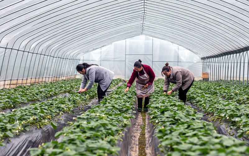 1月4日,村民在贵州省毕节市黔西县文峰街道马厂社区草莓基地的大棚内进行除草管护。