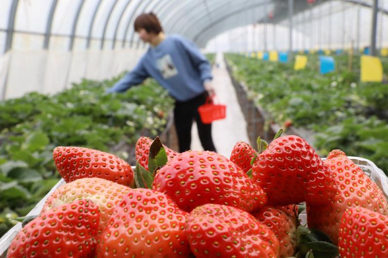 1月4日,河南省焦作市温县岳村街道办事处牛洼村的农民在大棚内采摘草莓。