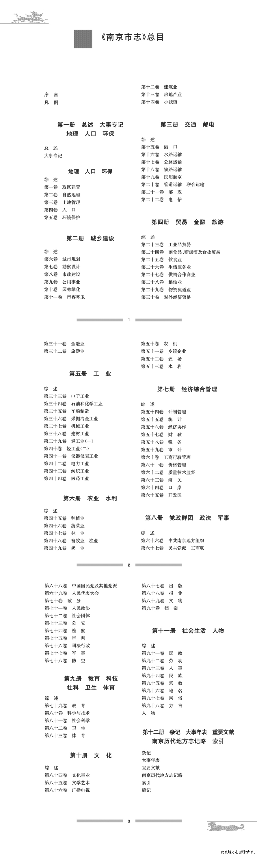 由南京市地方志编纂委员会办公室编著,方志出版社出版。该志书时间跨度大,编纂周期长,参与人员多,内容体量大。时间上,上溯事物发端,下限止于1999年;内容上,横陈百科,涉及南京的方方面面;编纂上,全市有百余个部门、近万人参与其中。全书完成历18年,分12册98卷,1500余万字。