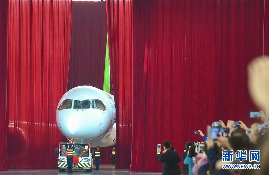 我国自主研制的C919大型客机首架机,在中国商飞公司总装制造中心浦东基地厂房内正式下线(2015年11月2日摄)。 新华社发(裴鑫 摄)