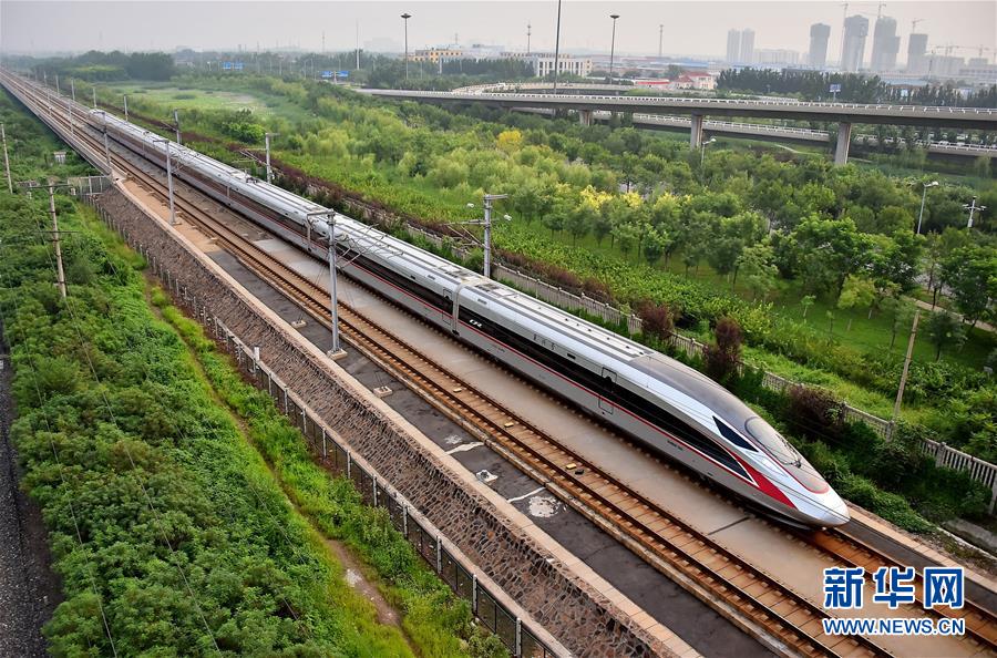 从北京南开往天津的C2001次“复兴号”中国标准动车组驶入天津市区(2017年8月21日摄)。 新华社发(杨宝森 摄)